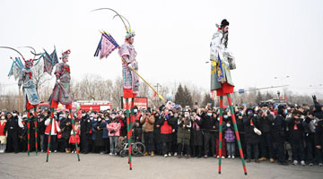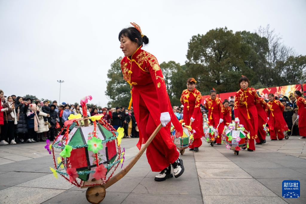 2月22日,在长沙县陶公庙前坪,民间艺人在庙会上滚灯车。