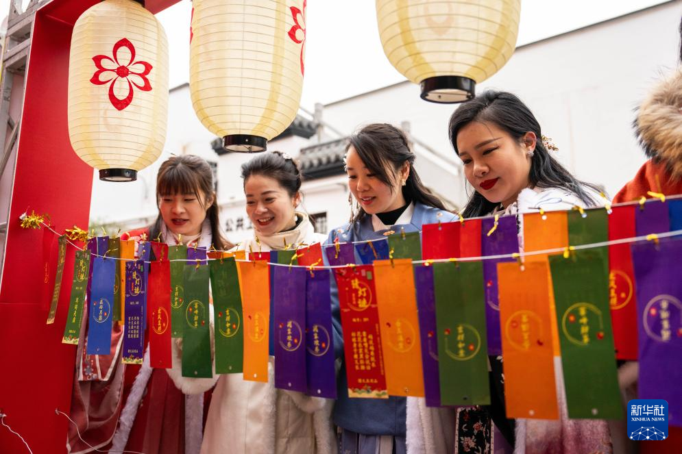 2月22日,在长沙县陶公庙前坪,游客在庙会上猜灯谜。