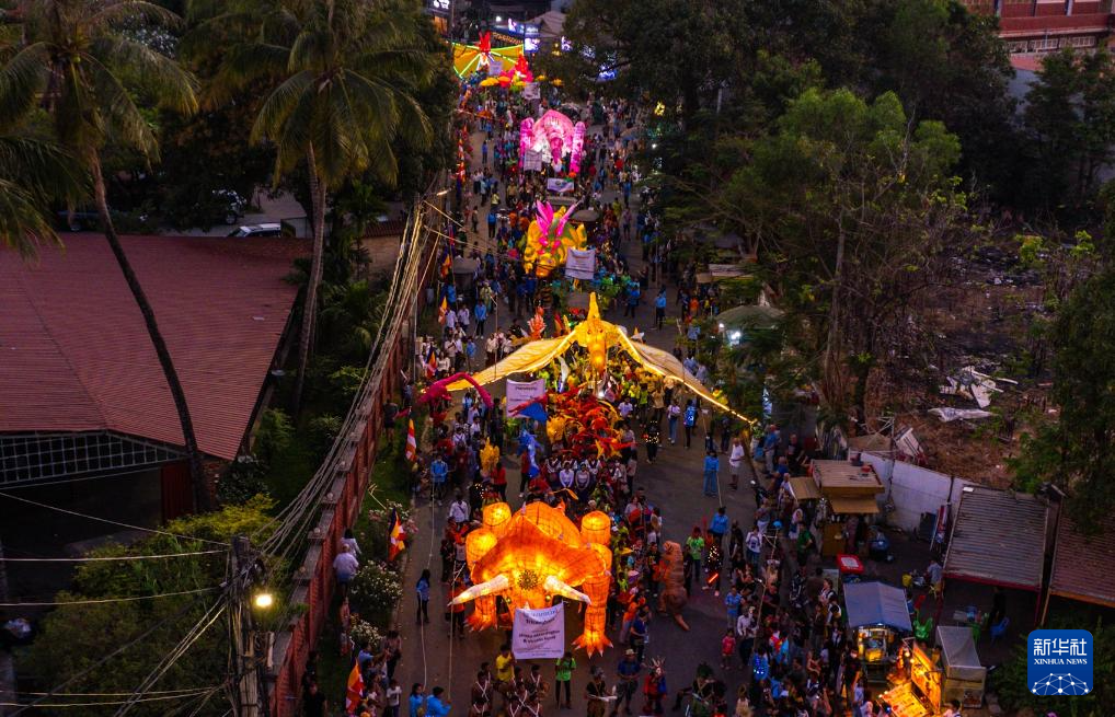 这是2月24日在柬埔寨西北部暹粒市拍摄的主题为恐龙的巨型彩灯装置游行(无人机照片)。