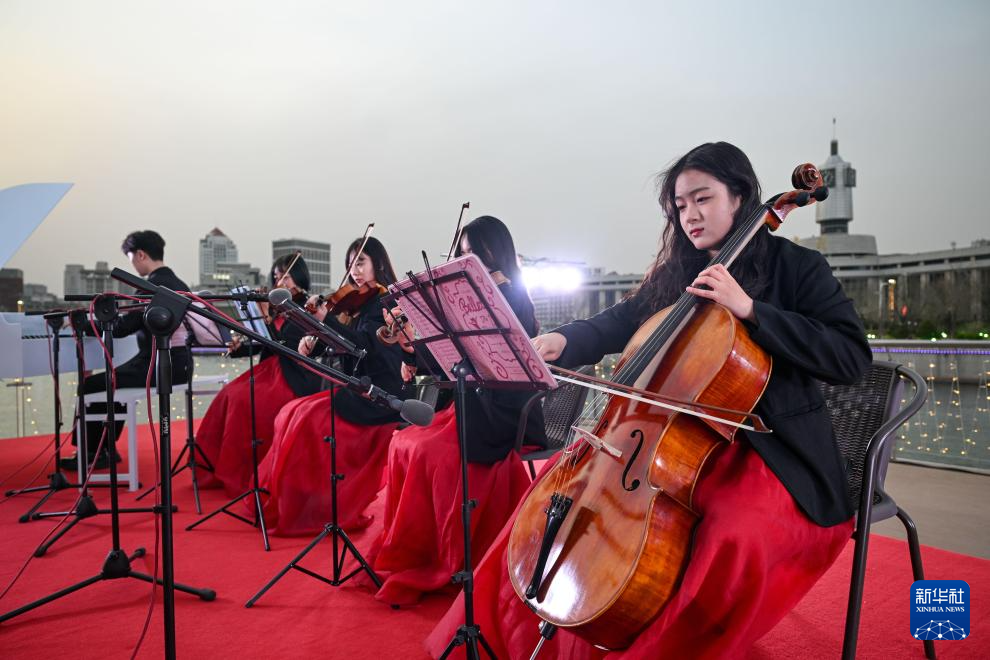 3月28日,天津交响乐团演奏者在海河游船上为游客演奏乐曲。