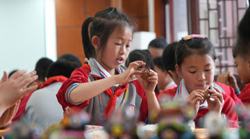 武凌云(前中)在太原市杏花岭区新建路小学校与小朋友交流(2023年6月26日摄)。