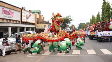武凌云(后排左四)和团队成员参加马来西亚国际关公文化节时与当地演员合影(2019年10月23日摄)。