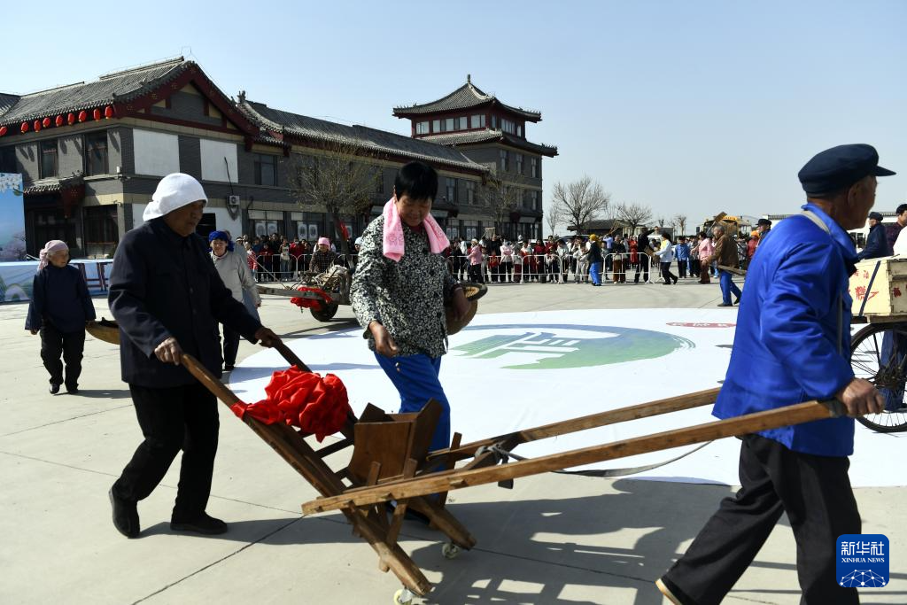 4月4日,水落坡镇乡村社火队队员在演绎鲁北乡村的传统生产技艺。