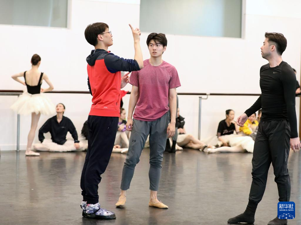 4月9日,作为《大地之光》的编导,上海芭蕾舞团副团长、首席主要演员吴虎生(前左)在指导演员排练。