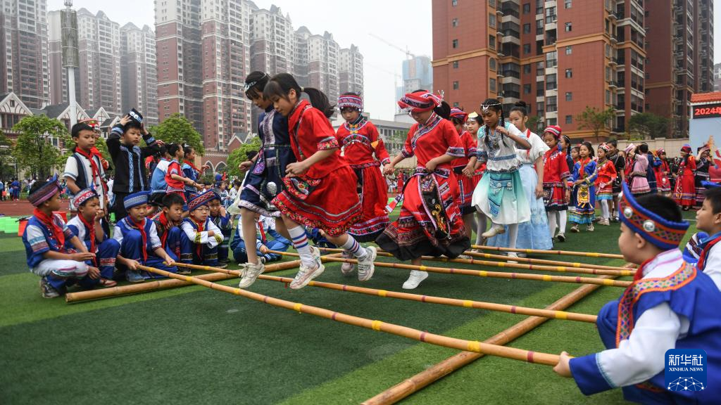 4月10日,钦州市第三十八小学的师生跳起竹竿舞,喜迎“三月三”。