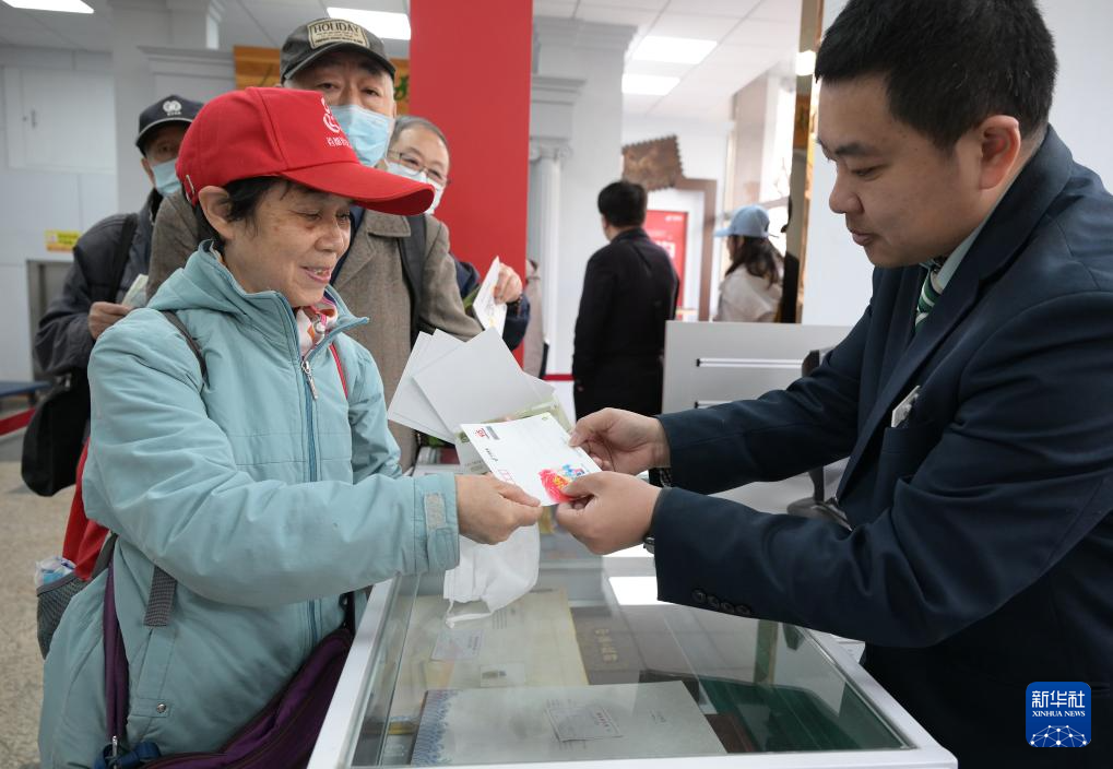 4月15日,市民在北京西城区马尾沟集邮营业厅排队购买《总体国家安全观提出10周年》相关纪念邮品。这是营业厅工作人员(右)向顾客交付其购买的邮品。