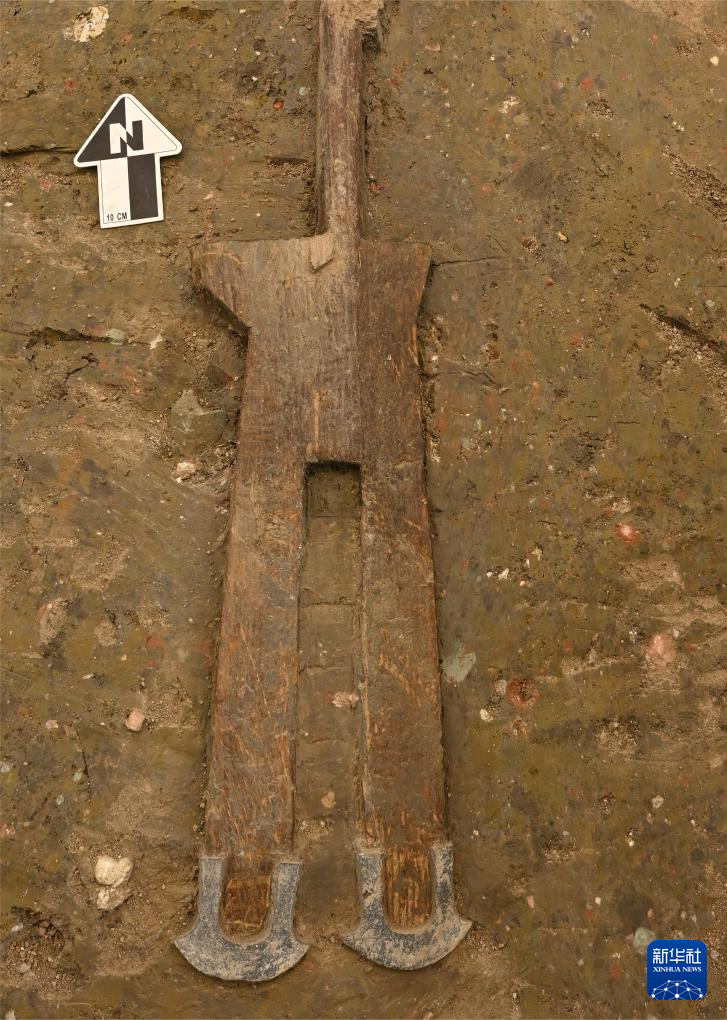 这是武王墩墓内出土木柄铁锸(2023年8月3日摄)。