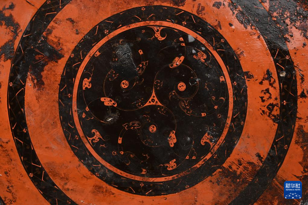 这是安徽淮南武王墩主墓内出土的漆盘(局部)纹饰。