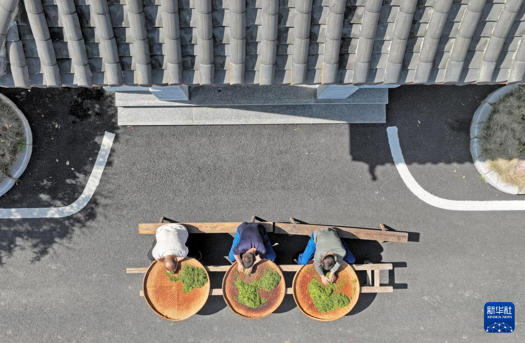 江西省修水县漫江乡的宁红茶制茶基地,俞旦华对茶叶进行传统萎凋工序(3月29日摄,无人机照片)。