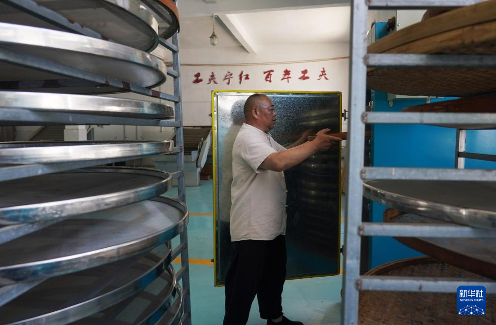 江西省修水县漫江乡的宁红茶制茶基地,俞旦华将茶叶进行机械烘干(3月29日摄)。