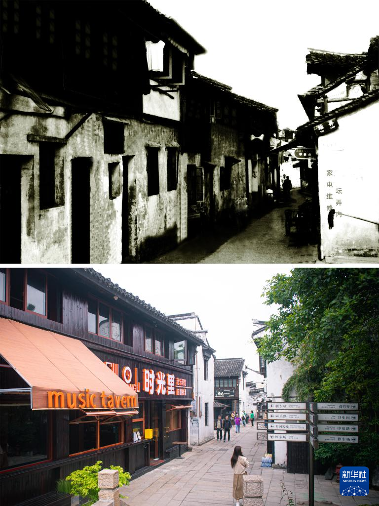 拼版照片:上图为1979年的嘉兴市月河历史街区小猪廊下(资料照片,庞艺影摄);下图为4月26日拍摄的嘉兴市月河历史街区小猪廊下(新华社记者江汉摄)。