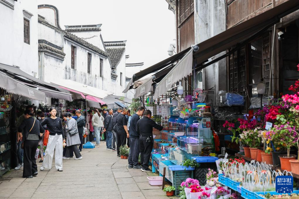 4月26日,游客在月河历史街区的特色黄酒店选购当地特产黄酒。
