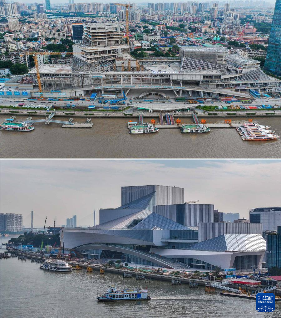 拼版照片:上图为钢结构施工阶段的白鹅潭大湾区艺术中心(新华社发,2022年7月21日摄);下图为即将竣工的白鹅潭大湾区艺术中心(新华社记者刘大伟2023年12月27日摄)。