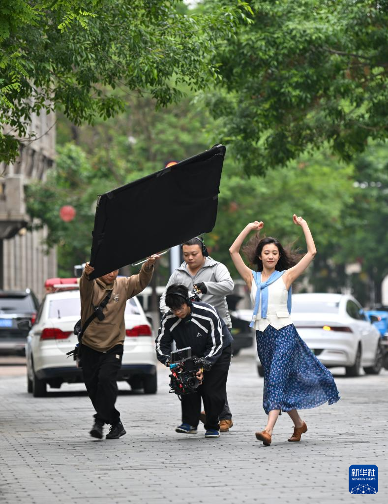 短剧制作团队在天津解放北路拍摄广告短剧(5月5日摄)。