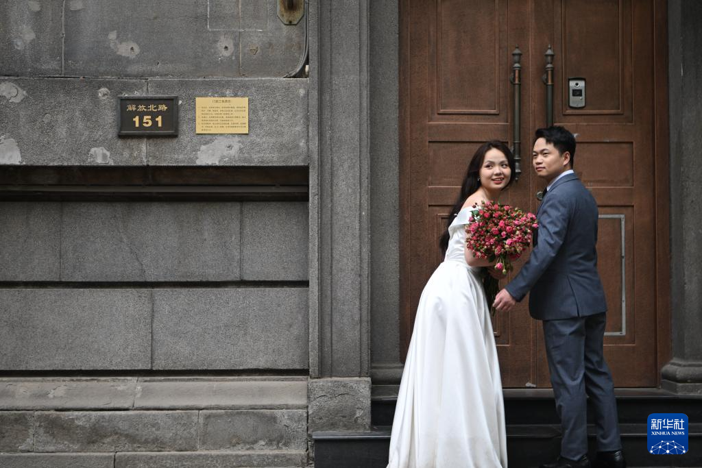一对恋人在解放北路历史文化街区的欧式风格建筑前拍摄婚纱照(5月5日摄)。