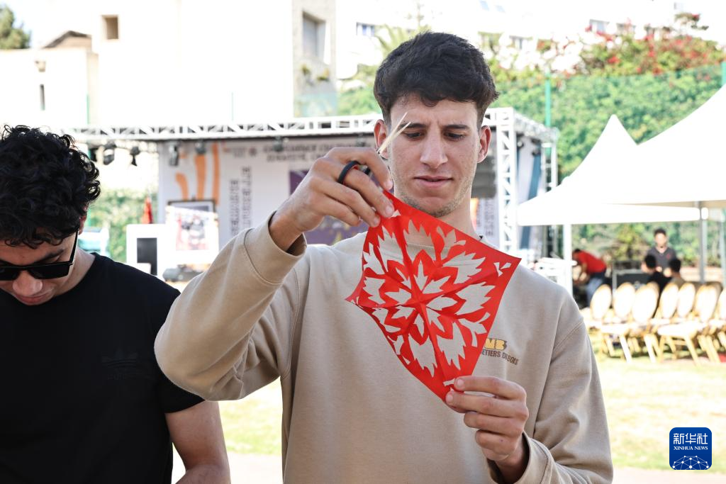 5月8日,在摩洛哥首都拉巴特,摩洛哥青年体验剪窗花。