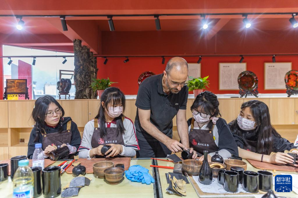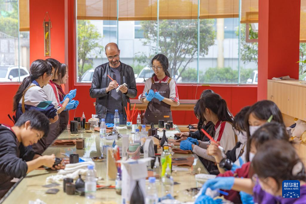 5月9日,法国漆艺家文森·漆(中)指导重庆市城口县职业教育中心学生练习上漆。