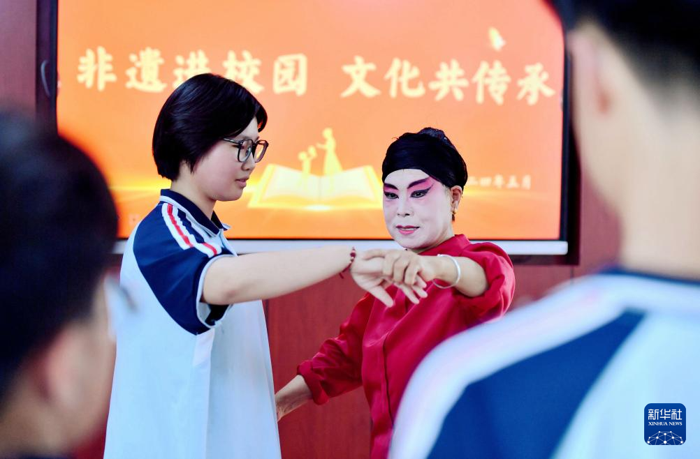 5月14日,时敬华(右)在威县固献中学传授乱弹曲艺。