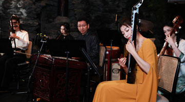 5月15日晚,在宁夏人民剧院,饰演李水河的侯艳(前)在《攒劲女人》中表演。