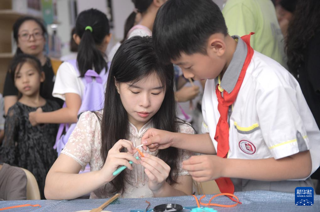 5月25日,乐贤坊小学的学生在广州市文化馆指导市民体验立体纸艺。