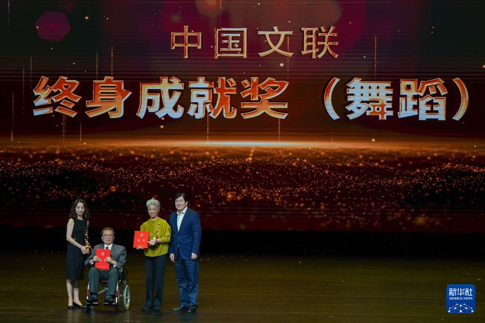 赵汝蘅(右二)、邢德辉(右三)在活动现场获颁中国文联终身成就奖(舞蹈)(5月25日摄)。