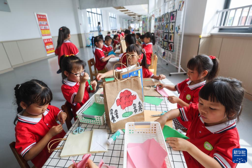 6月13日,孩子们在老师的指导下用剪纸贴画制作环保纸袋。
