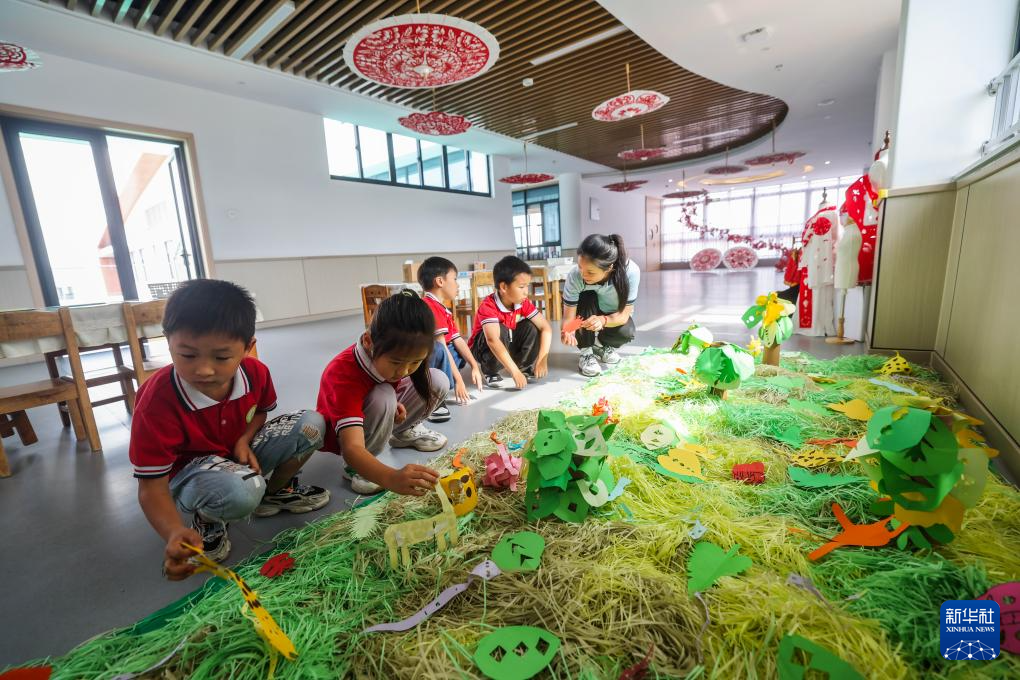 6月13日,孩子们在参加校园剪纸义卖活动。