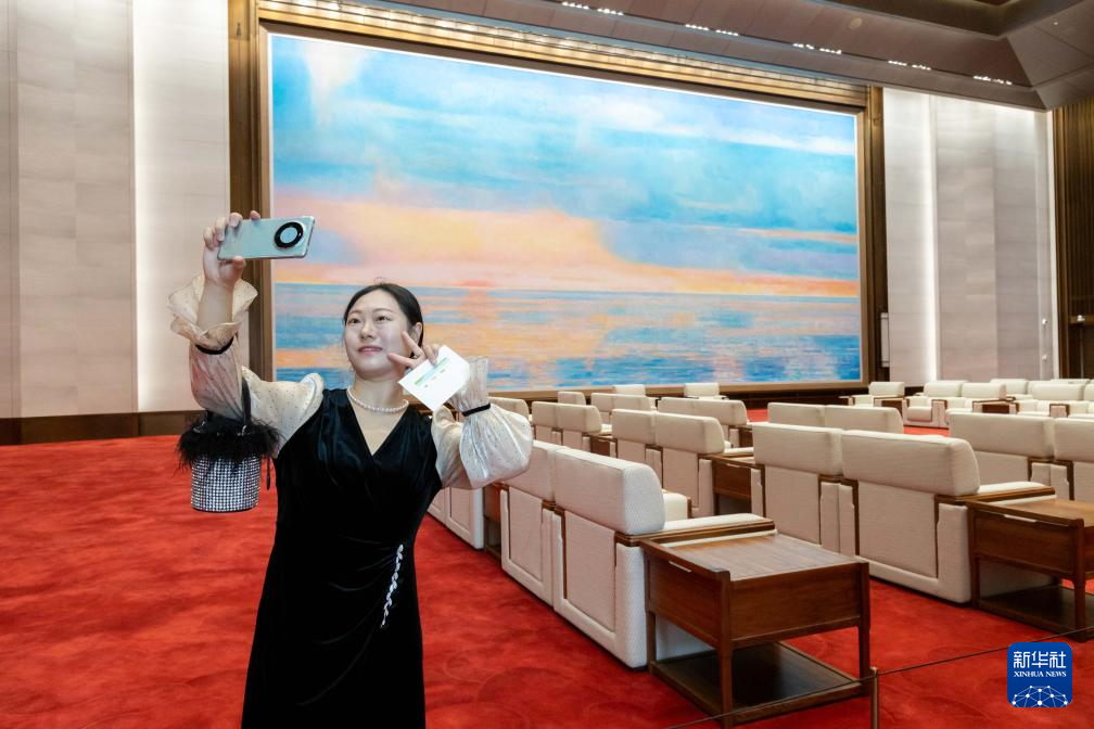 6月16日,市民在上海世界会客厅大会见厅自拍留影。