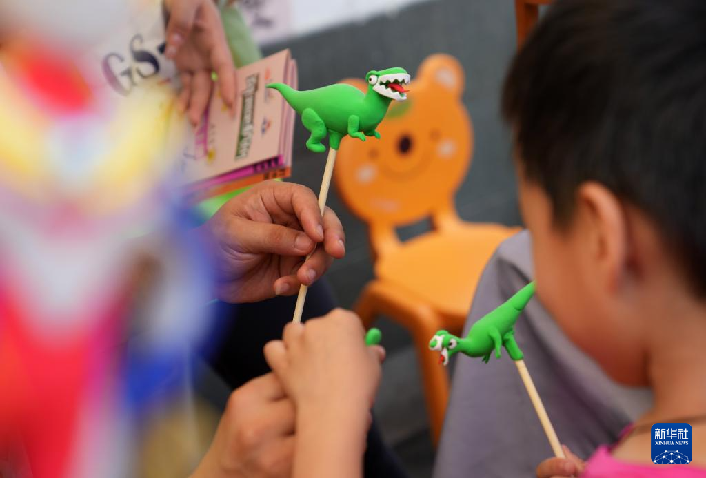 6月16日,小朋友在杭州桥西历史文化街区一处非遗体验点了解面塑制作技艺。