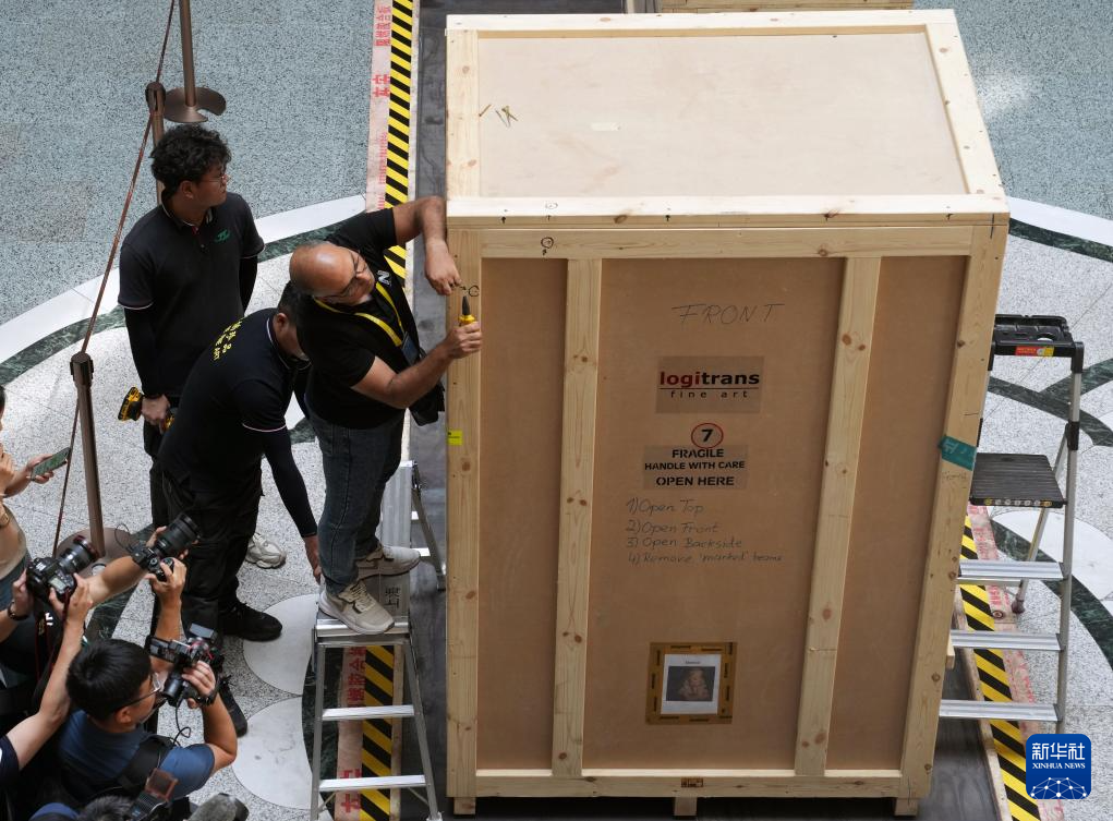 6月17日,在上海博物馆人民广场馆,工作人员打开彩绘人形棺的包装箱。