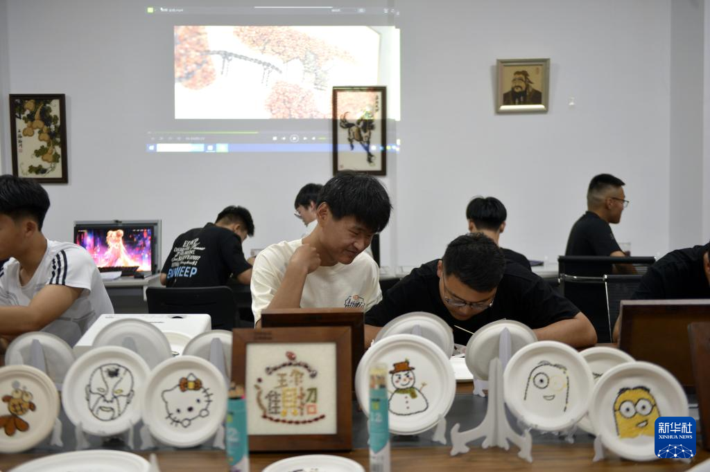 6月27日,学员在菏泽非遗传承馆学习制作粮画。新华社记者 刘力航 摄