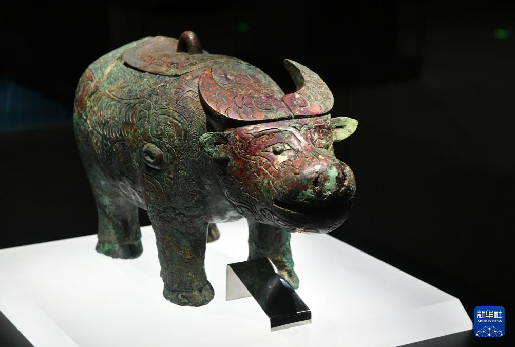 这是在殷墟博物馆新馆拍摄的文物亚长牛尊,是该博物馆的镇馆之宝之一(7月1日摄)。