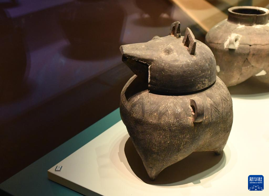这是在殷墟博物馆新馆拍摄的猪首陶器(7月1日摄)。