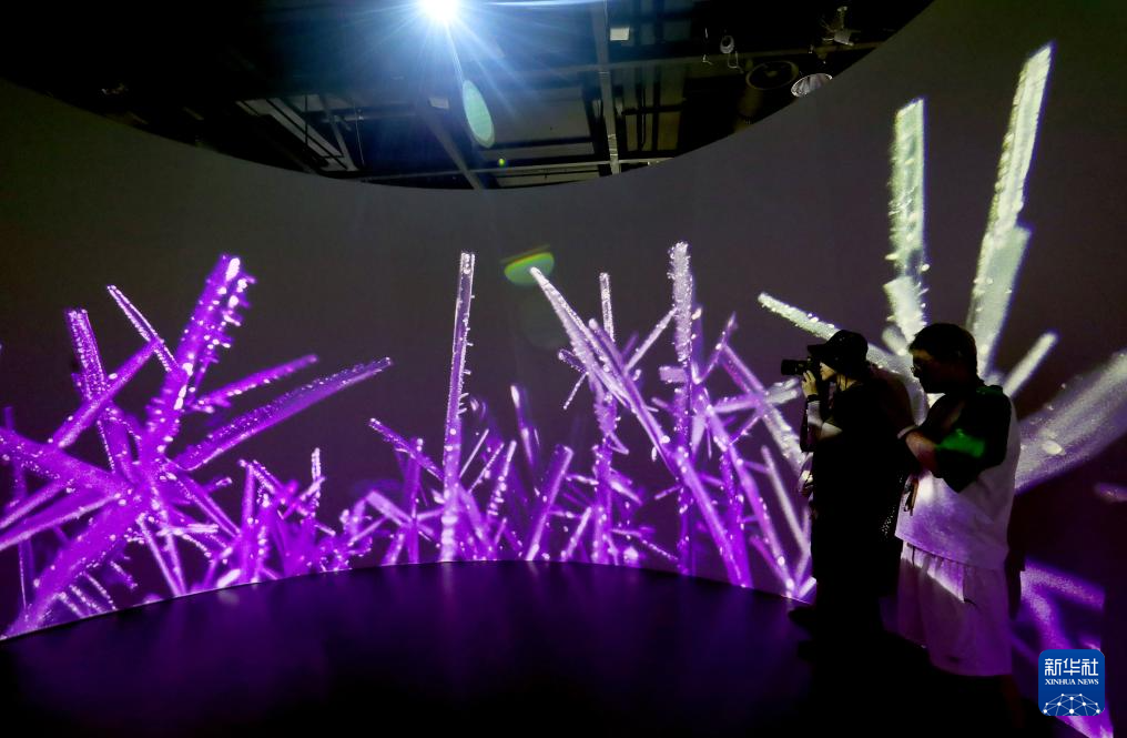 7月16日,参观者在球幕前观看展示水晶产生过程的影片。