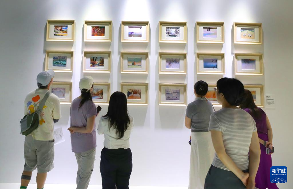 7月16日,参观者在宝石画艺术家刘全霞的作品墙前驻足观看。