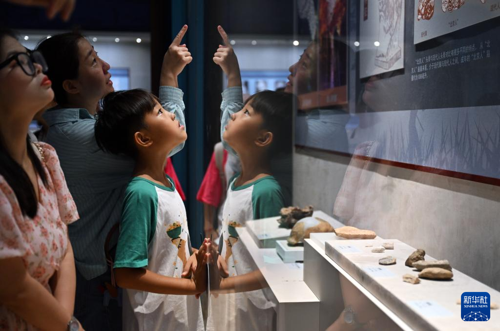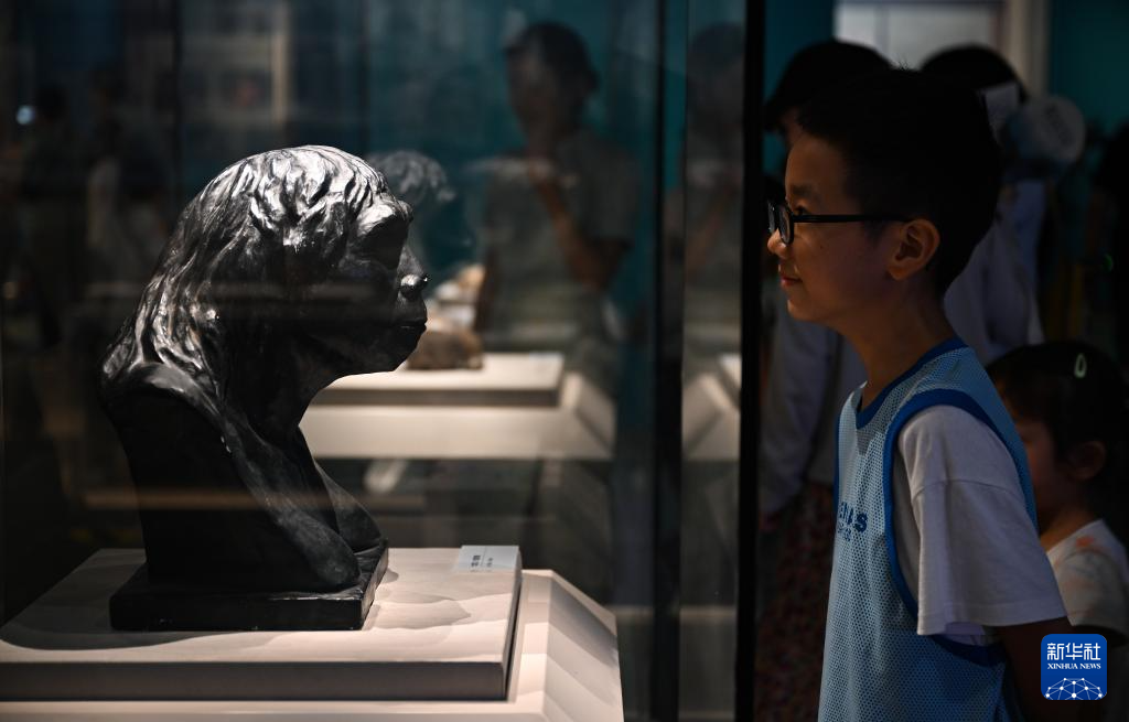 7月30日,一名小朋友在展览上观看“北京人”复原像。
