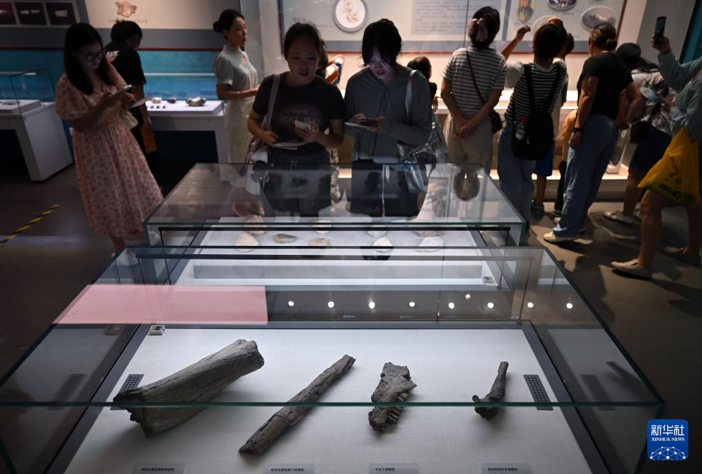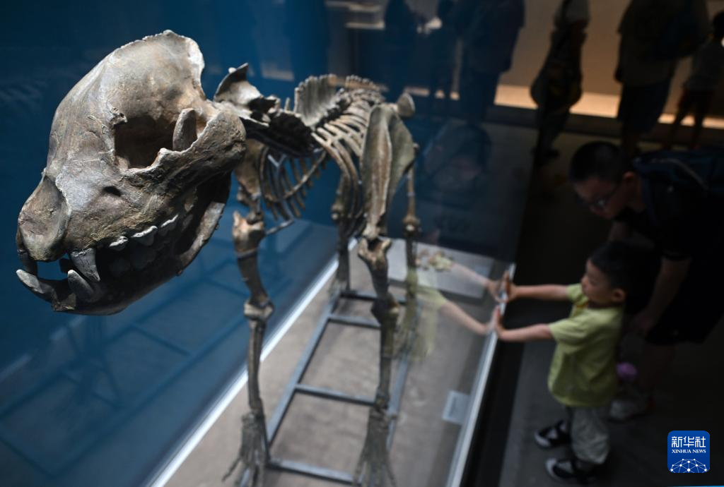 7月30日,观众在展览上观看中国鬣狗完整骨架模型。