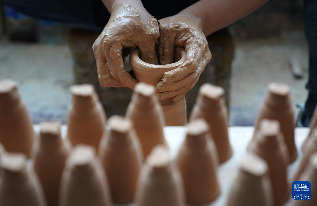 在善窑厂车间里,李善明在向徒弟传授利坯技巧(8月28日摄)。