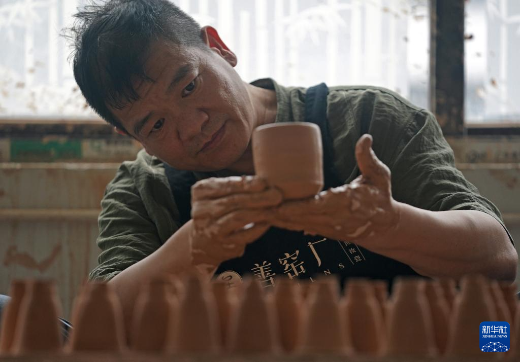 在位于江西省景德镇市善窑厂的车间里,李善明在查看产品(8月28日摄)。