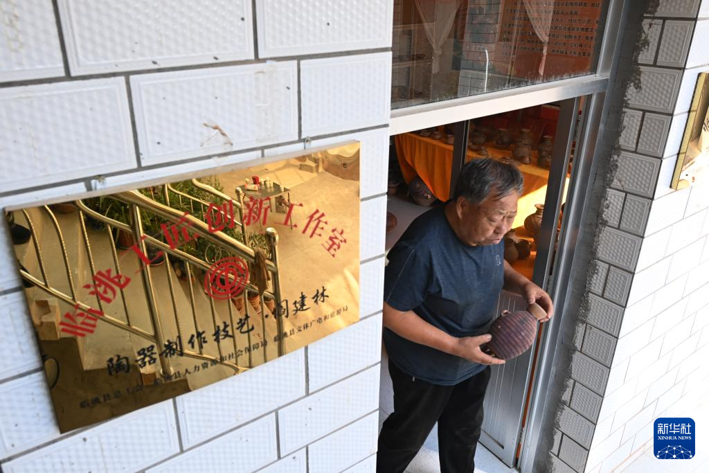 9月3日,阎建林在家中展示自己制作的彩陶工艺品。