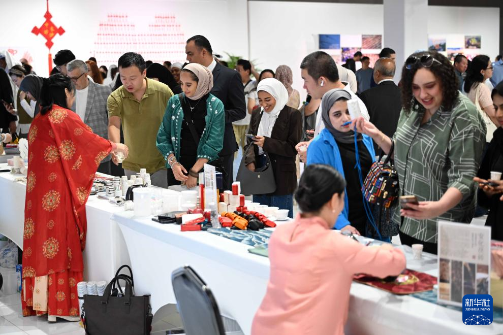 9月3日,人们在科威特艾哈迈迪省举行的“天涯共此时·湘约中东”文艺演出活动前参观中国茶艺文化展台。