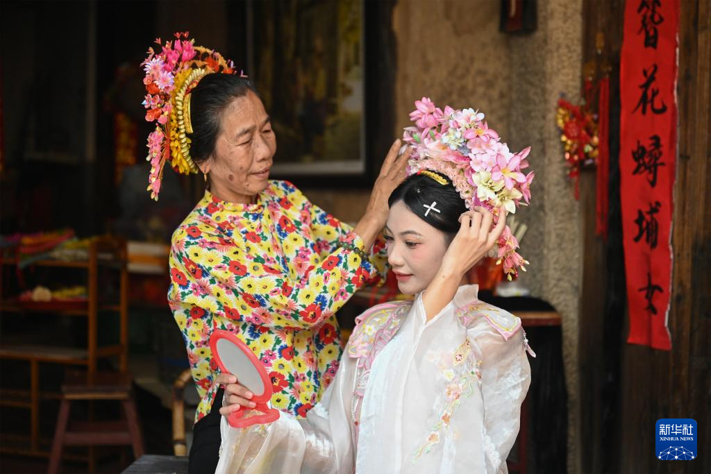 在福建泉州蟳埔村,翁秀珍为游客“簪花围”(8月27日摄)。