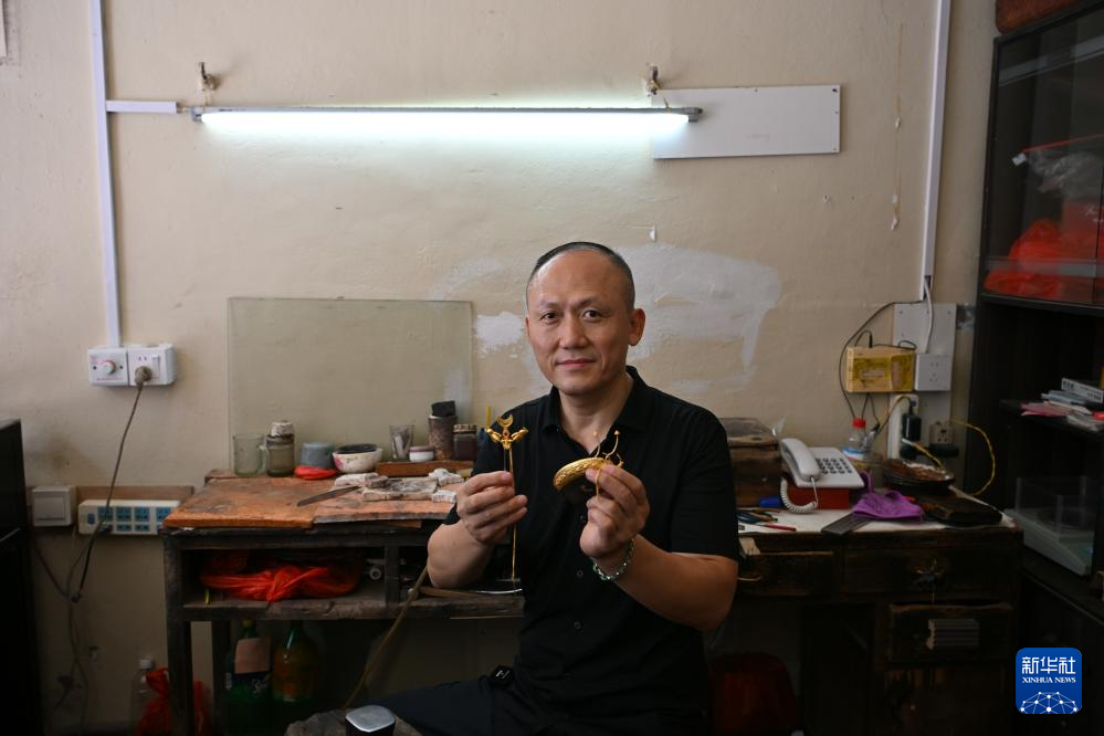 在福建泉州,王勇跃在工作室里展示他制作的蟳埔女金饰(8月28日摄)。