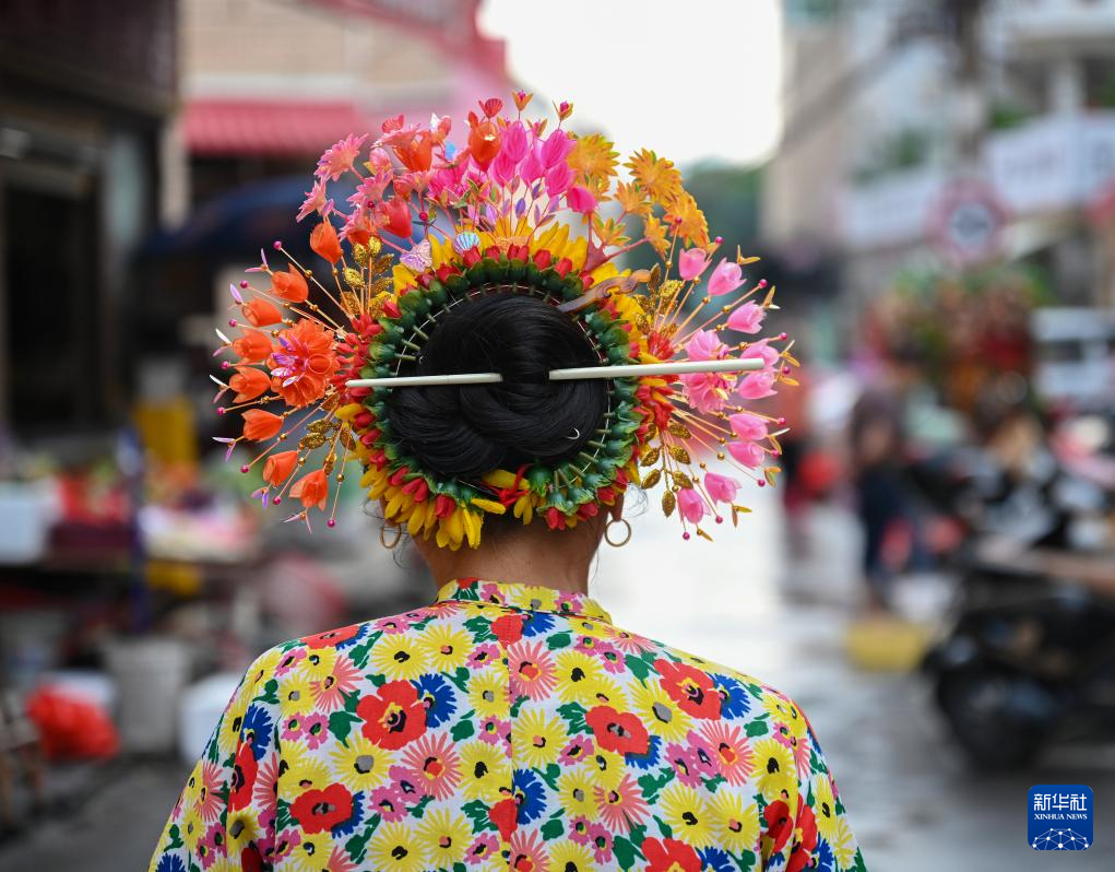 簪花时,蟳埔女先把长发扎成马尾,再将马尾盘起,用发簪固定。然后围绕发髻,环戴数层鲜花组成的花串。每逢重大节庆,蟳埔女还会在头发上插上传统样式的佩饰,以表隆重。