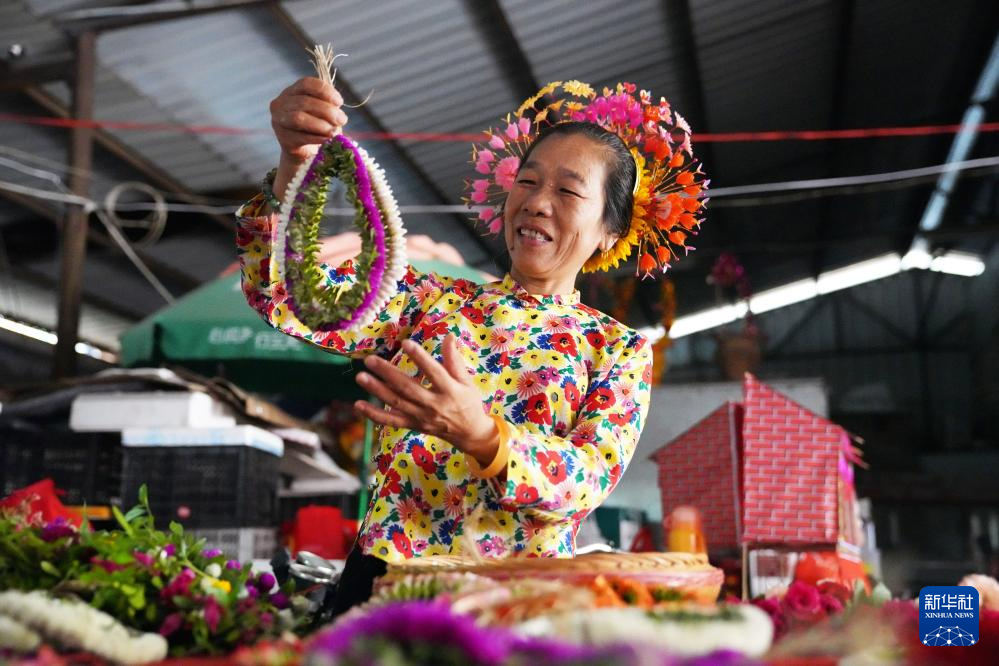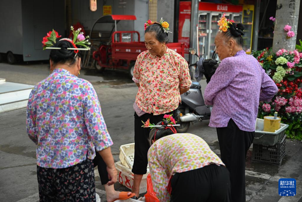 在福建泉州蟳埔村,翁秀珍在市场上选购“簪花围”使用的鲜花(8月28日摄)。