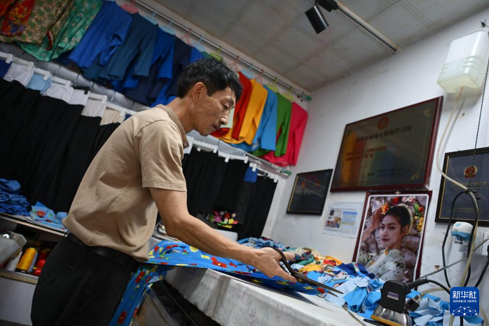在福建泉州蟳埔村,蟳埔女习俗代表性传承人黄晨在工作室里裁剪一件蟳埔女服饰(8月27日摄)。