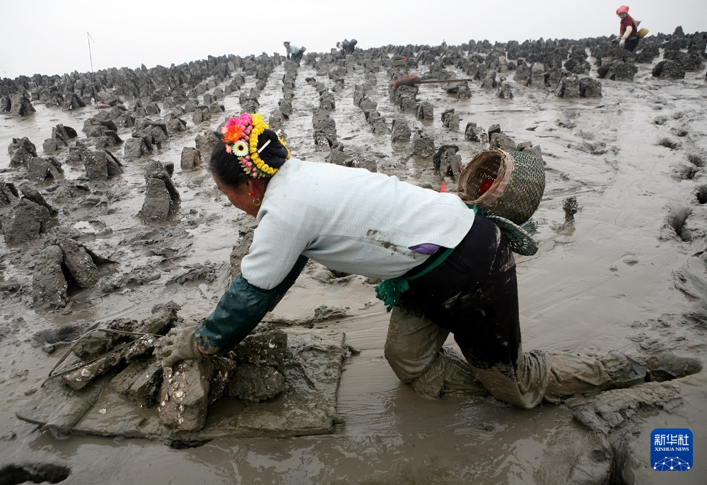 在福建泉州蟳埔村,蟳蜅女在滩涂上劳作(资料照片)。