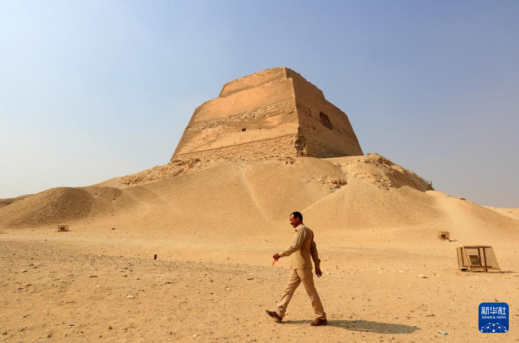 10月16日,在埃及贝尼苏韦夫省,工作人员走在美杜姆金字塔附近。