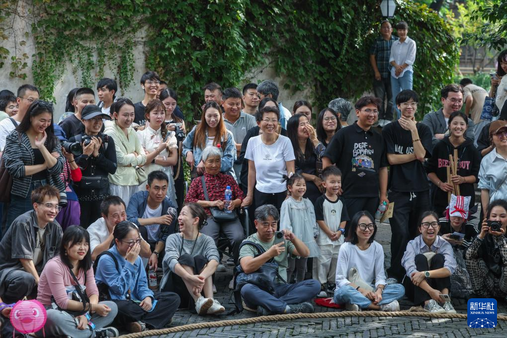10月17日,游客在乌镇街头观看古镇嘉年华的演出剧目。