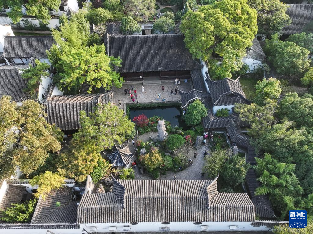 苏州园林西溪环翠游览景色(10月23日摄,无人机照片)。西溪环翠位于虎丘西南麓。